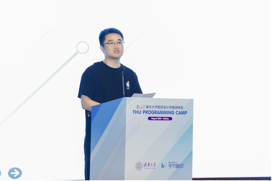 抖音研发负责人曹建栋代表字节跳动致辞,他首先感谢清华大学为同学们提供的良好训练资源和环境,其次对认真专注训练的同学们表示高度赞扬。清华大学与字节跳动再度因为训练营连接在一起,促成了更大范围的人才交流,提升了活动的影响力。最后他祝愿同学们永远保持好奇心和探索精神,保持对知识的追求和积极向上的态度,和优秀的人做有挑战的事。